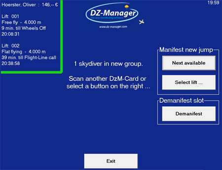 Skydivers can even see the lifts they are manifested on as well as their balance after scanning their DzM-Card.