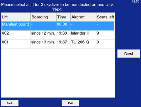 DZ-Manager includes a virtual Manifest- / Clipboard where skydivers can manifest themselves.